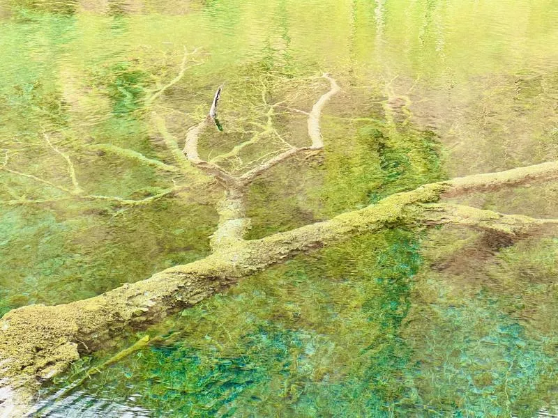 神仙池神奇秀美,其中的青龙海和神蛙海,枯木静卧水底,青苔遍布水岸。