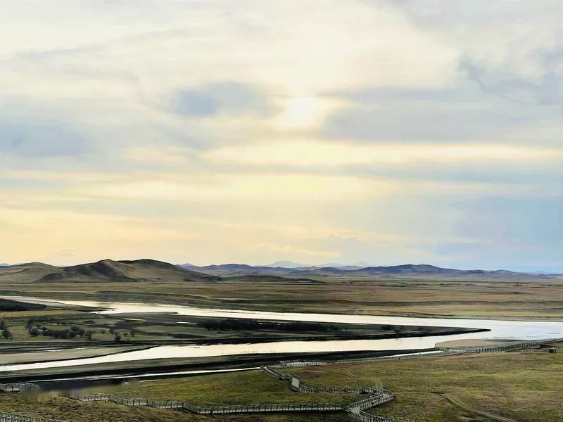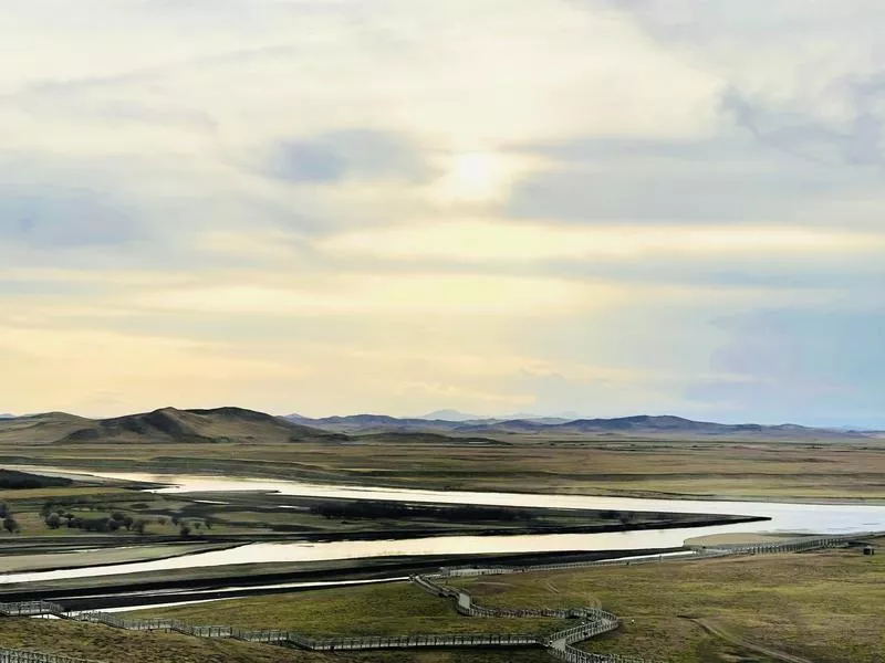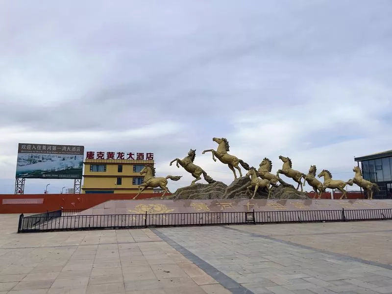 沿着大草原一直到达唐克的九曲黄河第一湾,黄河自青藏高原沿西北至东南方向蜿蜒徘徊于川、甘、青三省交界处,又折向西北回流甘、青两省,呈一U型湾,此即著名的九曲黄河第一湾。其湾顶处位于四川省若尔盖县唐克乡索克藏寺旁.有嘎曲(白河)汇入,黄河在此横切径约300米,嘎曲横切径约400米,黄河西岸属甘肃省界。
