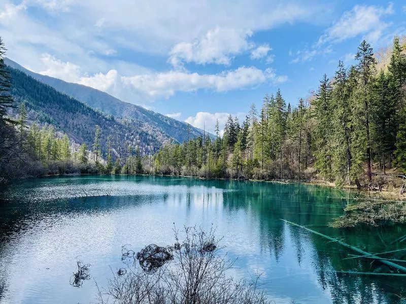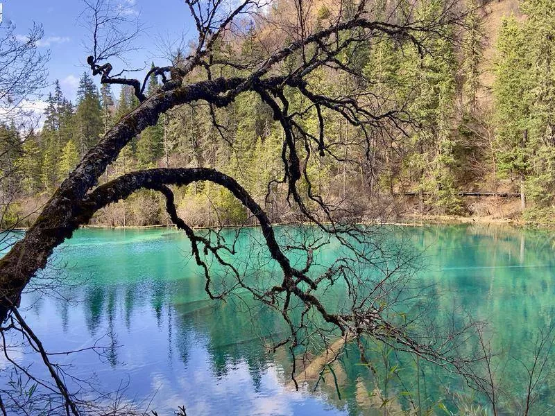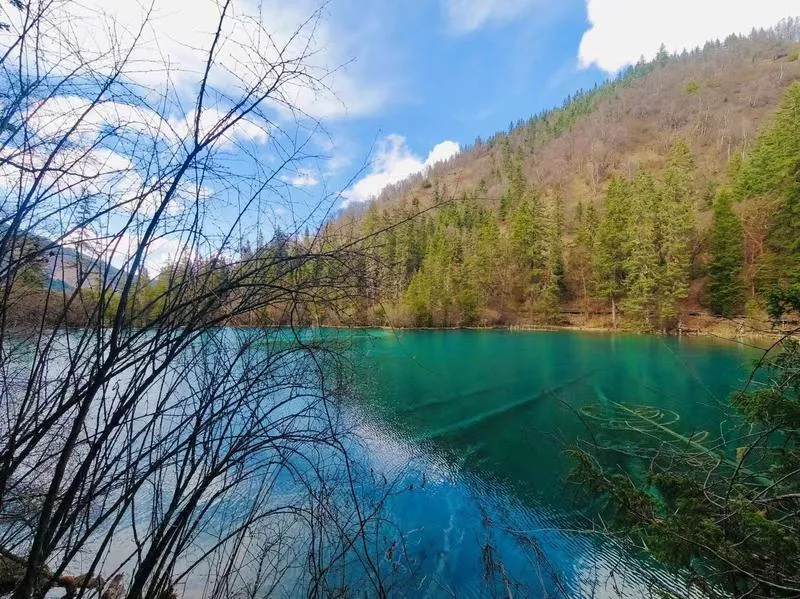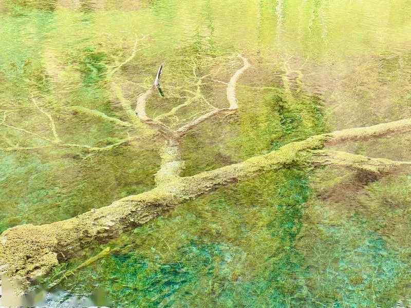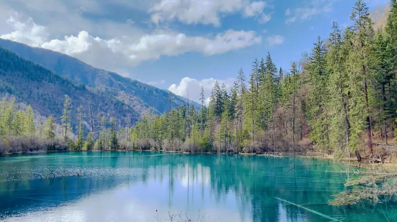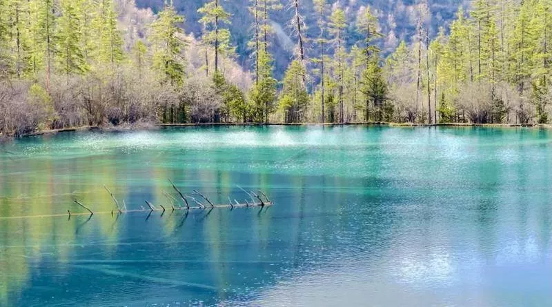 水中沉积在树木上的钙化物形成的钙化堤梗,它犹如一条青龙掩卧于蔚蓝的湖水中,欲腾欲飞,让湖水显得深不可测,传说中青龙海里的这条龙是嫩恩桑措仙女的第三条天龙,他才是真正用于和扎嘎山神相会的座骑。