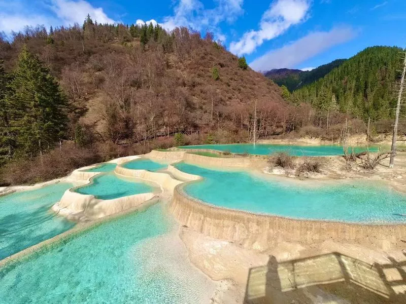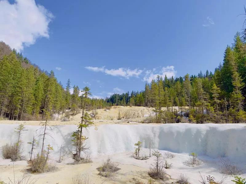 神仙池风景区内,能够看到高山海子、大面积钙化景观和茫茫的原始森林等景观。由于这里的地貌侵蚀切割得特别剧烈,溪间的落差大,山地形成了2600个大小不等、水色明丽的水潭和高山湖泊,也就是我们说的“海子”和“钙化台地”。它是典型的地表喀斯特地貌,成片的山坡被黄色、乳白色钙质包裹,形成一个个奇特的盆筑状钙化池和钙化坡