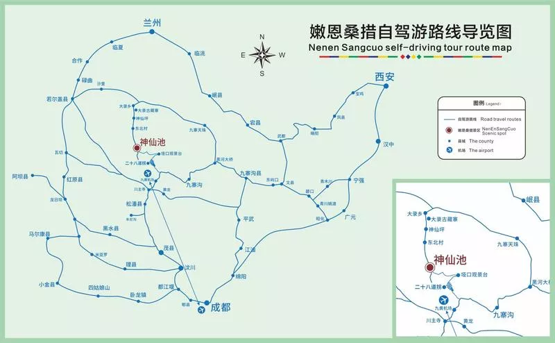 通往嫩恩桑措(神仙池)景区的道路有三条:第一条是从若尔盖经巴西会议遗址巴西镇、求吉乡翻越喇嘛岭(海拔3990垭口),经大录古藏寨及神仙坪自驾营地到神仙池,全程143公里第二条是川主寺至九寨沟之间的上寺寨入口,途径拉莱河坝、最美网红公路28道拐、日月观景台、亚龙那日神山(意为不留泪的神山海拔3688米)垭口,到达神仙池全程45公里第三条是九寨沟县城出发,经黑河大桥沿途景点有黑河大峡谷、喇嘛石、悬泉、九寨天珠、大录古藏寨、神仙坪自驾车营地等景点到达神仙池,全程128公里。