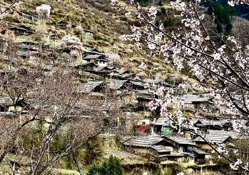走到寺庙的最高处的观景台,可远观大录古藏寨和早期的第一个村寨----沙勿村。这里的杏花开得正艳,层层叠叠的藏居,掩映在杏花树下,春意盎然。