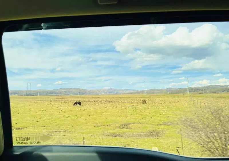 进入红原县境内,在龙日坝大草原奔驰,金色的草原一望无际,四月中旬的草原,金色的草已经开始返青了,金黄色带着绿意,蓝天白云雪山,牦牛在悠闲的吃草,车窗外是一幅幅美丽的图画。