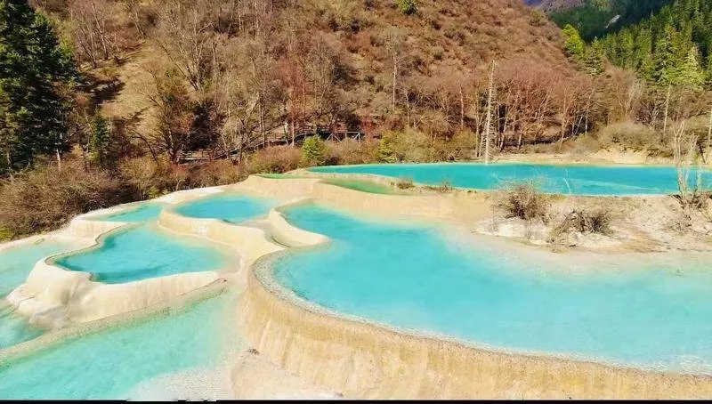 金流泛波:景观由边石坝和彩池、钙华流和钙华瀑布形态组成,其中以水流在壮阔的钙华流上的水纹别有特色,可称奇观。介绍
