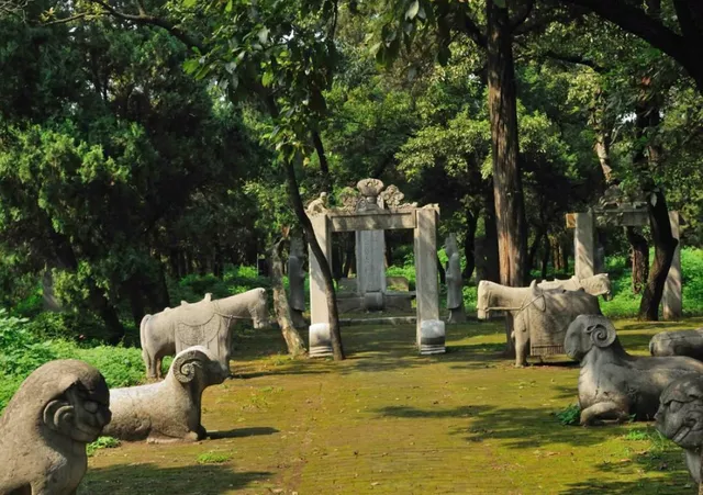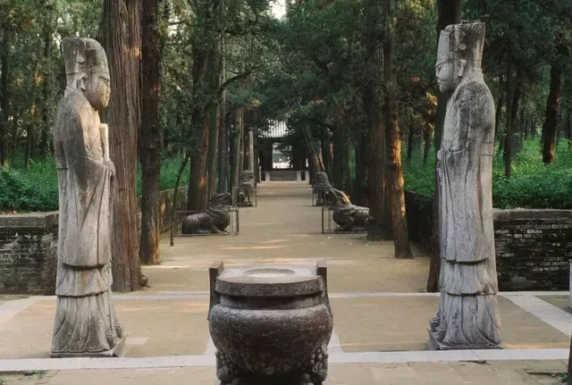 《墓葬千年在,林深五月寒》,孔林中现树十万株以上。传说孔子死后,“弟子们都用四方奇木来植,故多异树,鲁人几代无名,”至今孔林中仍有一些树叫不出他们的名字。在这些大树中,柏、桧、柞、榆、槐、楷、朴、枫、杨、柳、雒离、女贞、五味、樱花等各种类型的大树,盘根错节,枝繁叶茂;野菊花、半夏、柴胡、太子参、灵芝等数百种植物,也依时争荣。孔森林不愧是天然植物园。《断碑深树下,无路望》。万木掩映的孔林中,碑石如林,石器成群,除了一批著名汉碑被移入孔庙外,孔林中还有李 东阳、严嵩、翁方钢、何绍基、康有为等明清书法家亲笔题写的碑文。所以孔林又被称为真正的碑林。