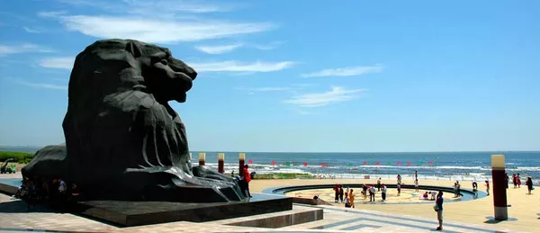 气焰澎湃的雄狮观海雕塑,长21米,高10米,是我国当前最大的单体狮雕,建立投资100万元,被称为“百万雄狮护大海”,它气势汹汹的驻守在金色的沙岸,好像守望着碧蓝的大海,维护着旅客的平安,企盼着景区的辉煌前景。