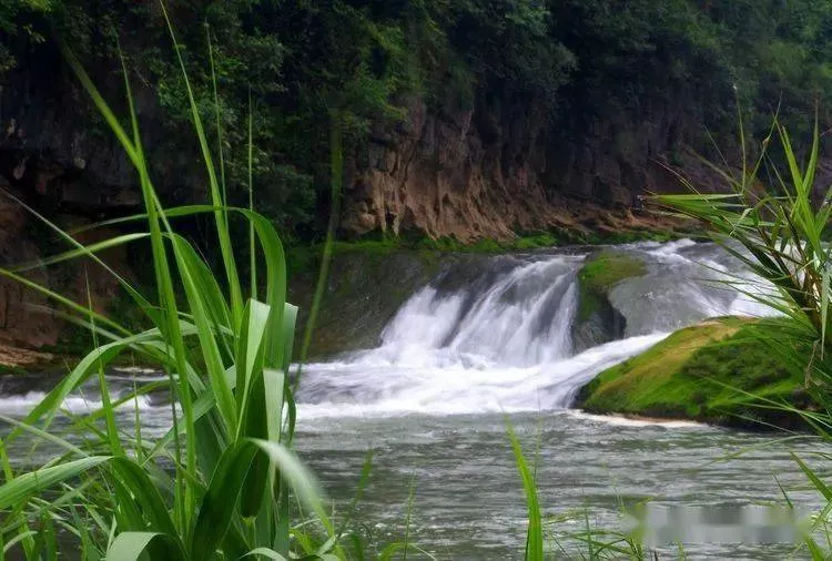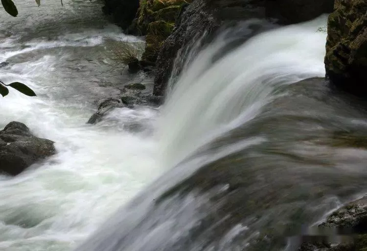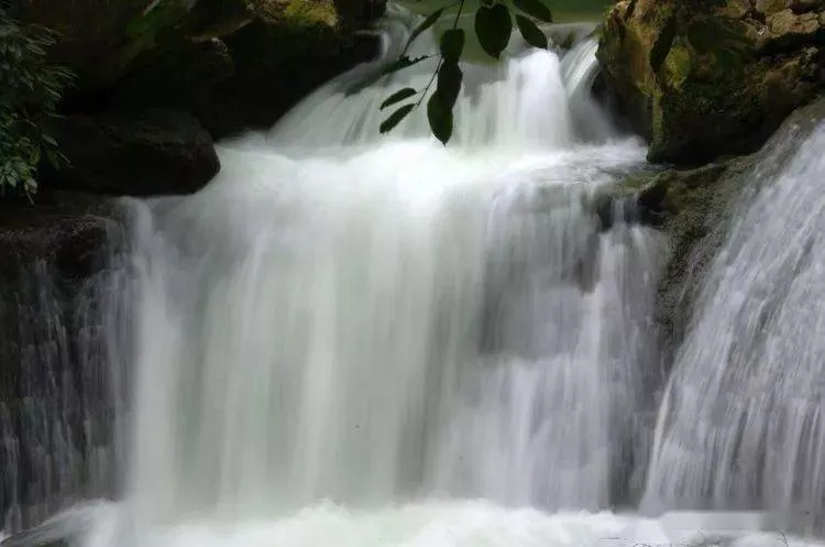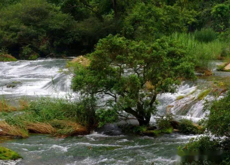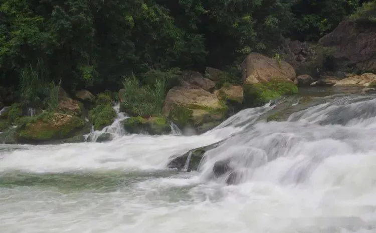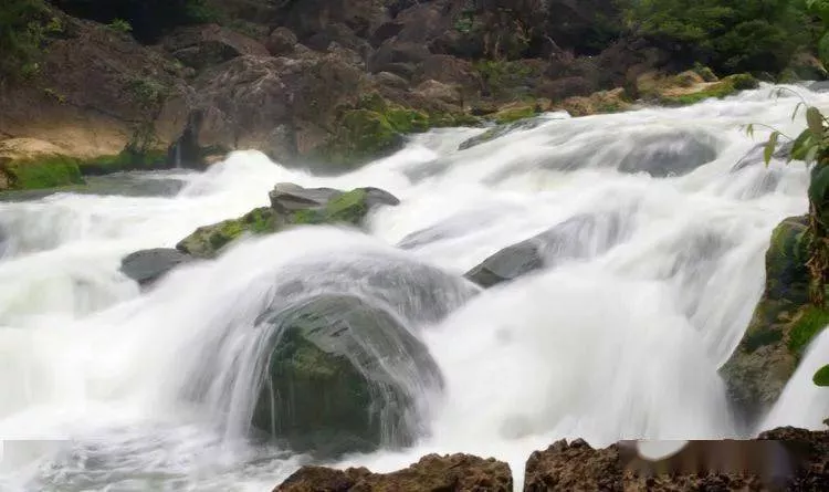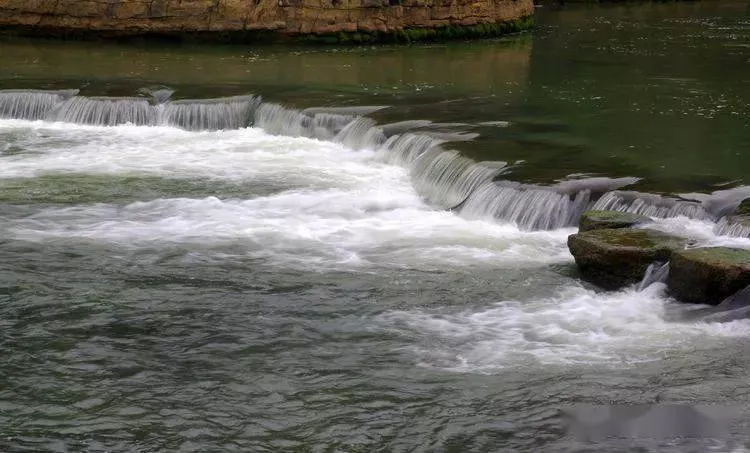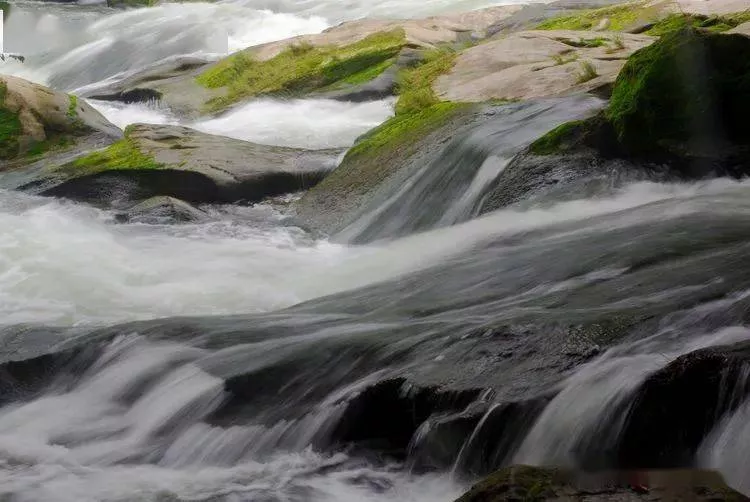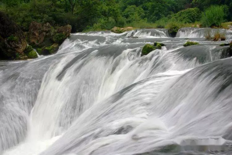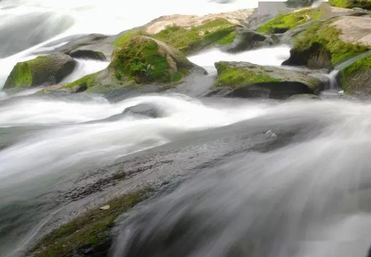 下午2点,到陡坡塘瀑布,太阳猛烈,正是一天中最炎热的时候,好在溪滩岸荫翳树林和溪中的急滩瀑流,给人撑阴送凉,行路中倒也不觉得炎热。白花花的瀑布宽宽地一幅接一幅,从林荫空隙露,林密处只见一角,林空处能见一整幅,瀑布无拘无束地泻奔,只见宽,不见高,一滩一瀑,一潭一井,水急为急流,为瀑布,瀑流生花,水流随溪滩石床石岩不同的形态,或高低参差,或呈环形、弧形,飞泻出不同形态的瀑流,水静则为潭为井,或为溪流,只是那样柔柔的绿绿的一色,嫩嫩的,静静的,有如碧玉。溪边溪中的水草,这儿一丛,那儿一丛,或是一大片,随水流溪风摇曳。
