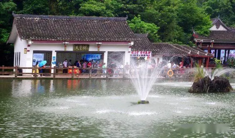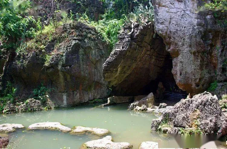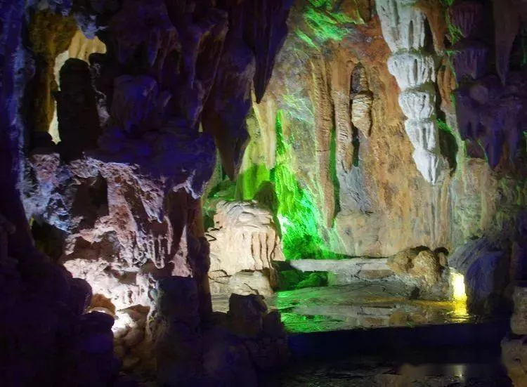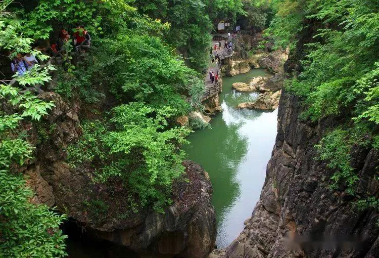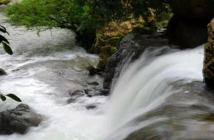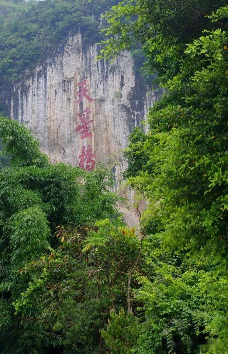 继续下行,过吊桥,入天星洞,天星洞是一个典型的喀斯特地貌溶洞,洞径曲折,洞中有石厅、石柱、石笋,还有各种奇形怪状的岩石,色彩斑斓,琳琅满目。出洞续行,路多曲折,过桥上桥,顺溪行,忽然听见水声了,及见溪,急流涌雪,乱石罗列,水石相撞,桥上桥下有一涌泉,水流喷涌翻腾不绝,水量浩大,即冒水潭。