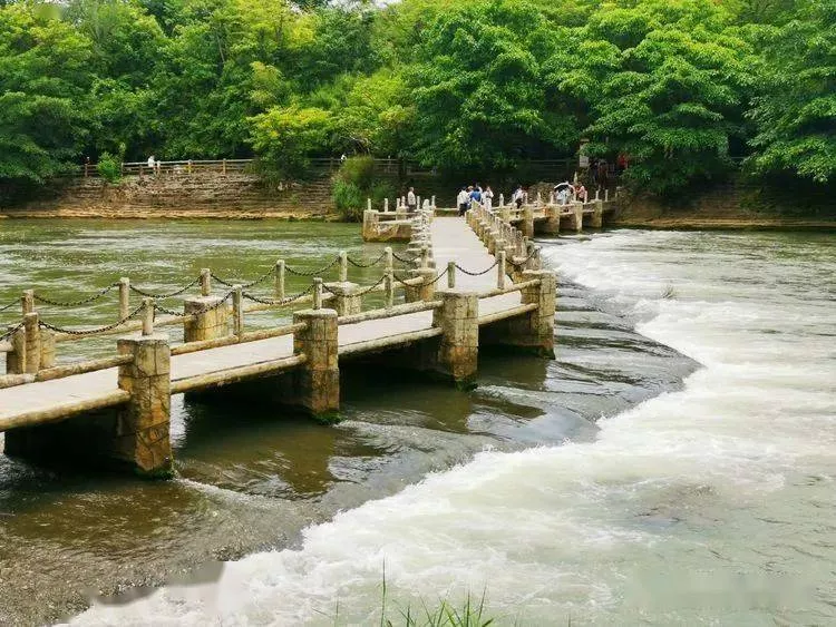 溪中有一石桥,曲折于急瀑,视线所及,尽览一溪之瀑布、急滩,过桥沿溪行,林荫遮水,沿路瀑滩时隐时见。过得真亭、霞客亭,再过一桥,到乘车点返回,结束一天的旅程。