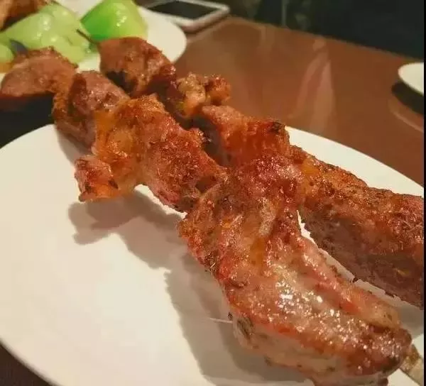羊肉串肉中夹筋,筋肉相连,闻着味儿香,吃着更香。价格12元一串并不贵,但绝对保真量足!