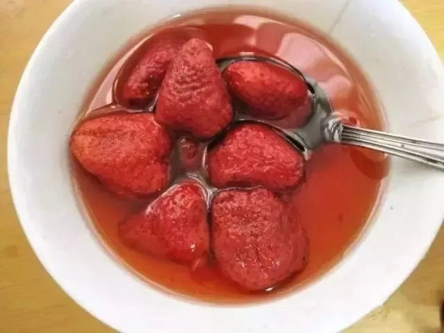 大颗草莓泡在糖水里,还保持着本身的口感,味道比红果更酸一些,不会那么甜,吃进嘴里的感觉真不赖!