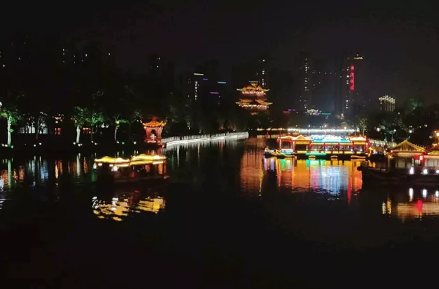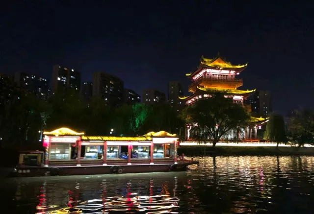 每到夜幕降临,华灯初上,河岸上流光溢彩,在黄色灯光的装饰下,整个国师塔仿佛一座金塔,各种各样的古式建筑在灯光的衬托下,显得虚幻又美妙。每到一个景点都会介绍景点故事和来源,在这凉爽的季节,坐在游船上,微风拂面,河边柳枝飘动,欣赏着两岸让人流连忘返的景色,真的是别有一番滋味。