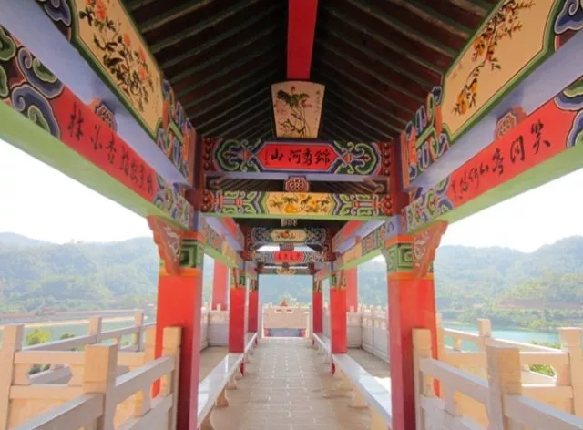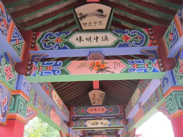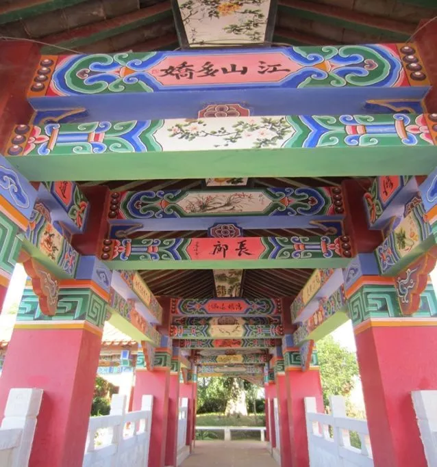 这些亭子牌坊塔楼使整条长廊富于变化,既有点缀景观作用,又有倚衬和支撑长廊的作用,还能方便行人纳凉休闲、车辆通行的作用。三是观赏性强,长廊楹联书画是长廊中珍贵的艺术品,一路观景赏联,驻足观书看画,令人赏心悦目,叹为观止。五是在建筑形式上具有中国古典园林特色,直廊、爬山廊、曲廊、回廊蜿蜒曲伸,错落有致,时隐时显于青山绿水之间,远眺青山,近临绿水,是游客陶冶情操,呤诗作画,休闲娱乐的好去处。