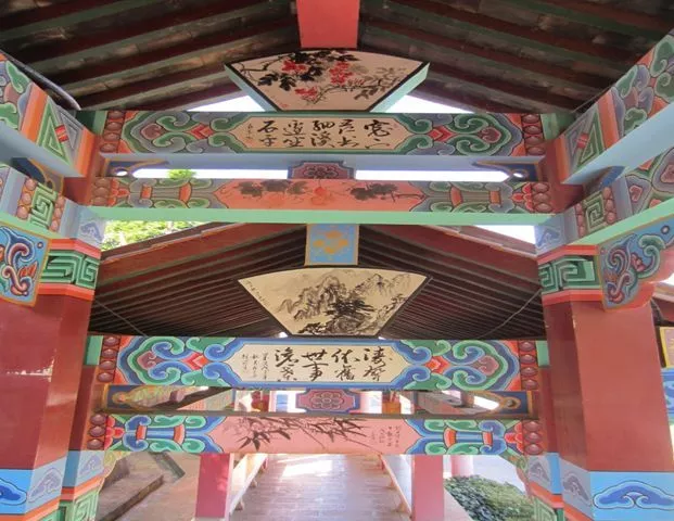 走近长廊,一股强烈的人文气息扑面而来,在桂树和红枫的簇拥之下,我们将品尝一道文化大餐。“文化长廊”背依水上乐园,匾牌式糙白玉护栏上