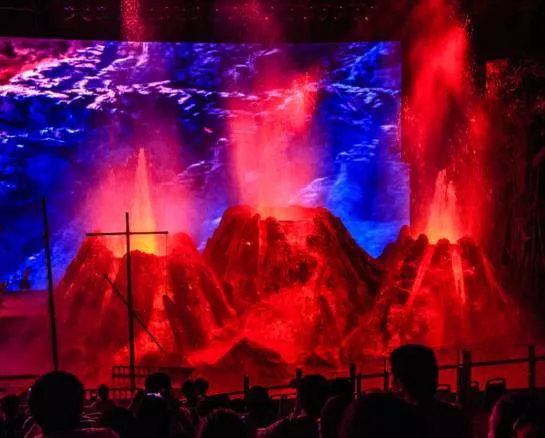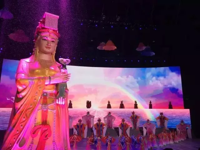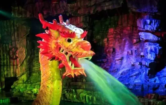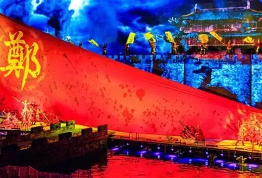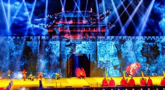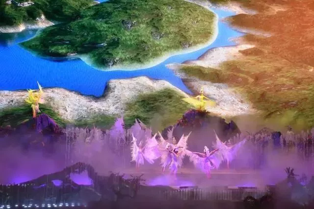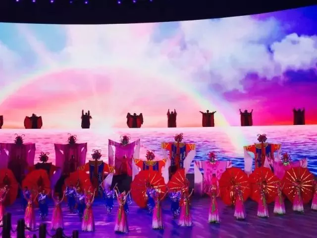 载歌载舞,玄幻梦幻,2000吨水从天而降,泛起滔天巨浪,营造"黄河之水天上来"的磅礴气势,17米高的巨型金龙腾空而起,撇下甘霖,福泽万民