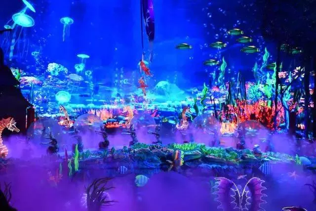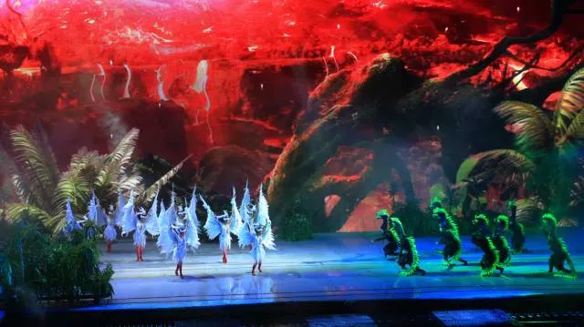 首先吸引眼球的是大.小恐龙的表演.而雨林冰川的变化喻意沧桑巨变,栩栩如生的机械白鹭展翅9米迎面飞来喻意鹭鸟的形成