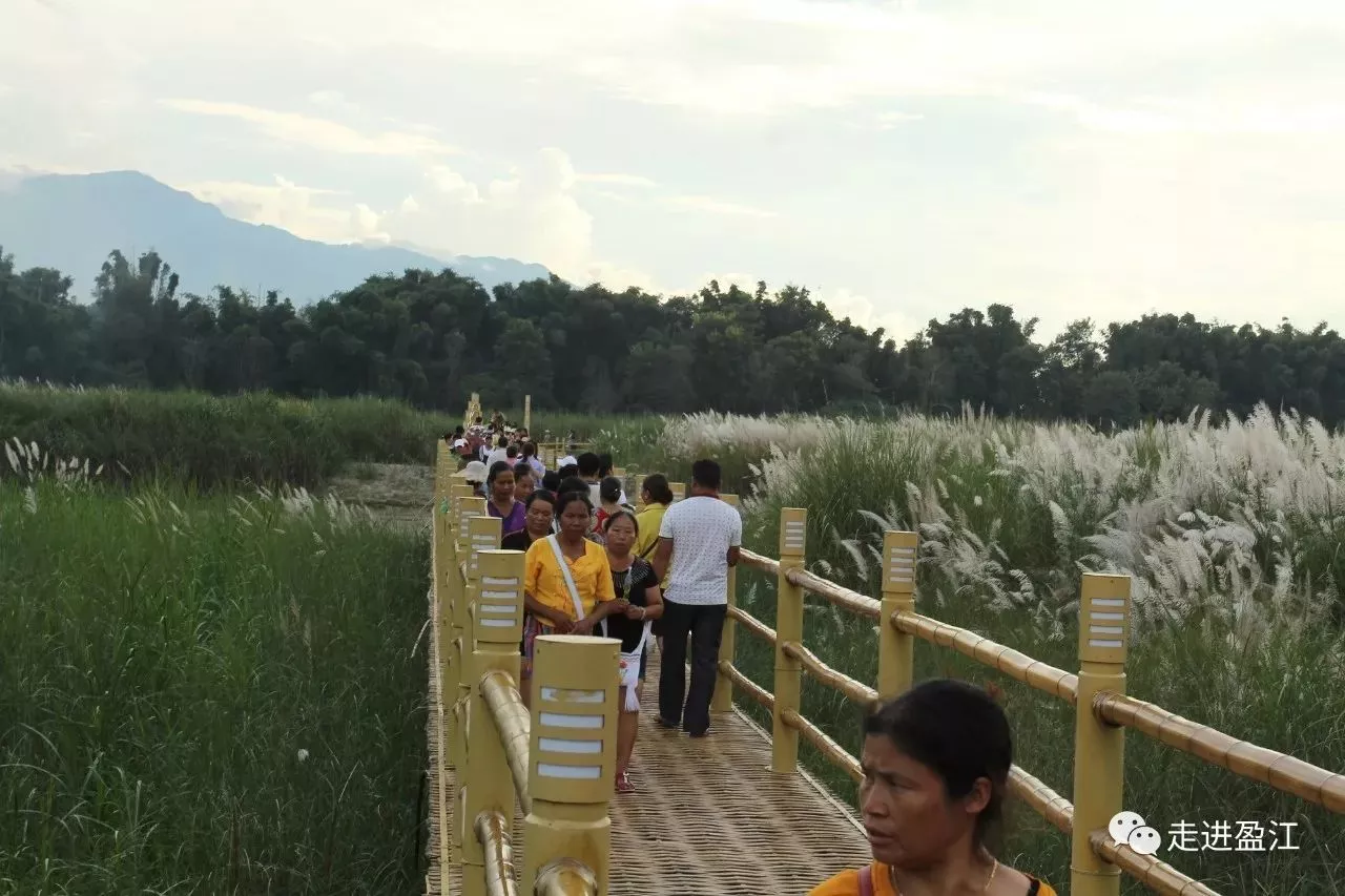 盈江:花海热度不减 游客行走在竹桥栈道之间