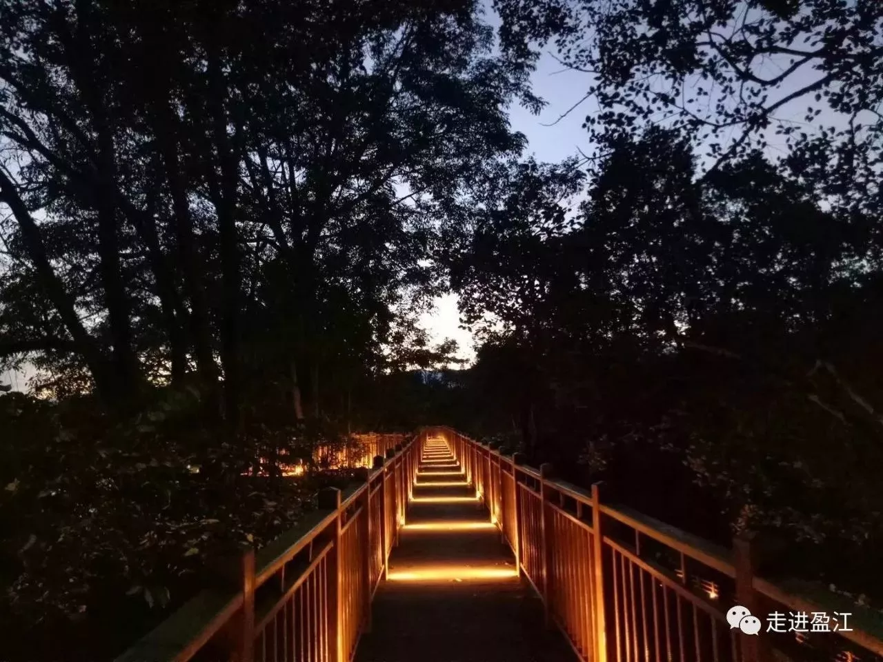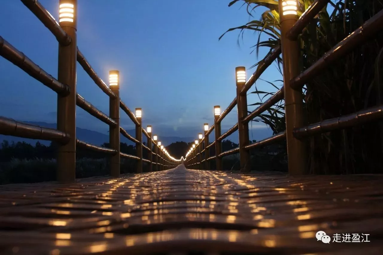 夕阳西下,景灯初上,栈道竹桥被点亮,鲜明的轮廓倒影在波光粼粼的水面,远山轻雾渐消失在暮色之中……