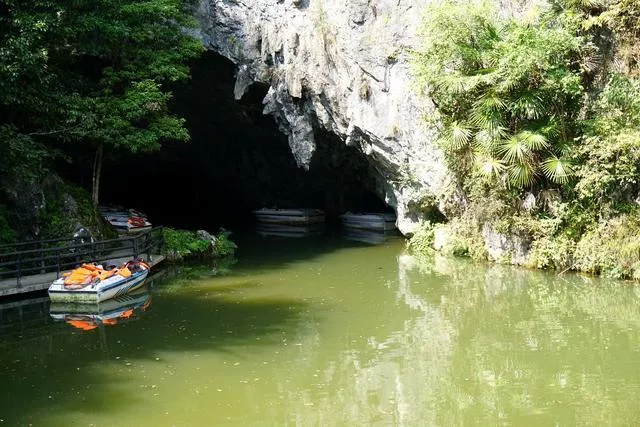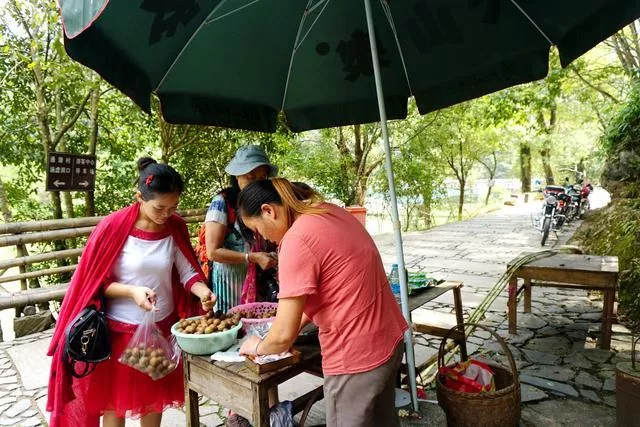 灵岩洞共由36个溶洞组成,涵虚洞是其中最大开发最好的一个,也是我们要游玩的景点之一。在溶洞进、出口处,当地人摆放着水果、零食卖给游客,生意还不错。