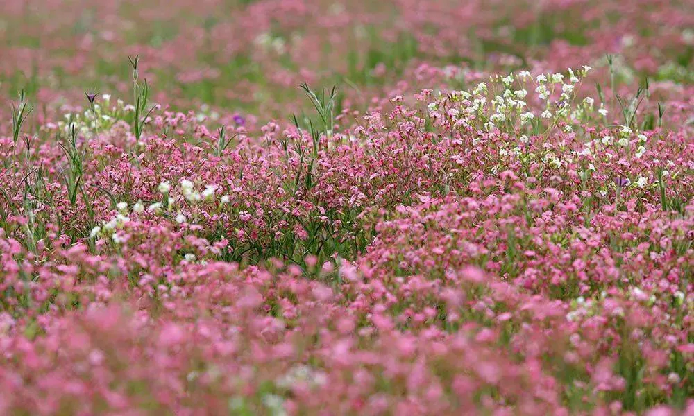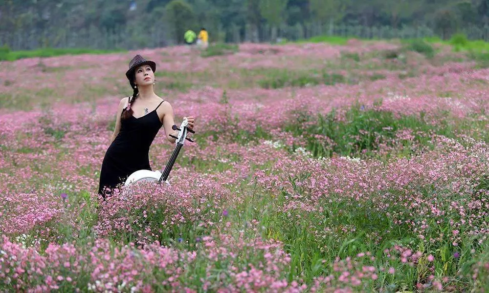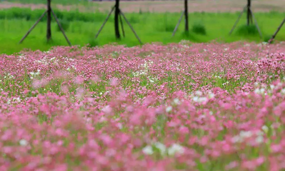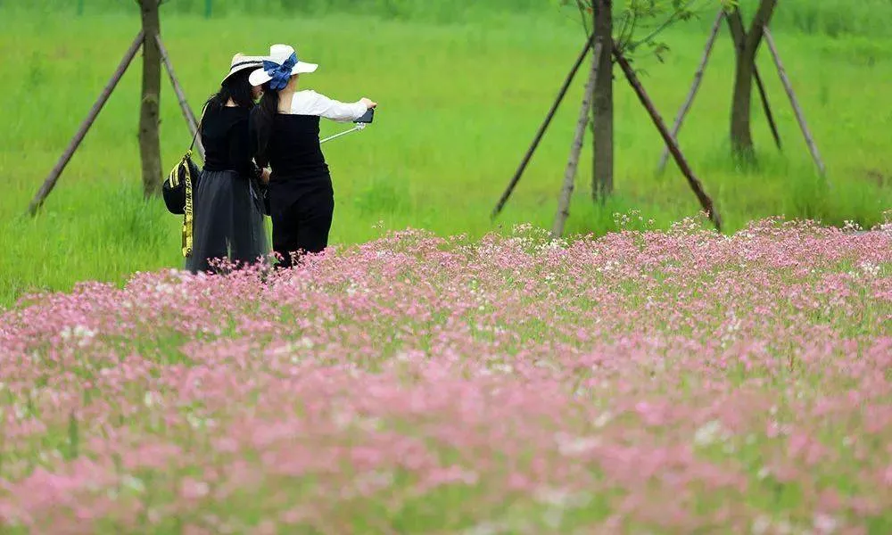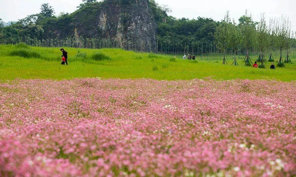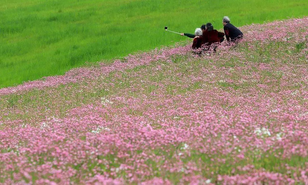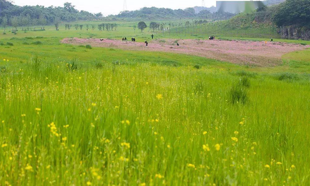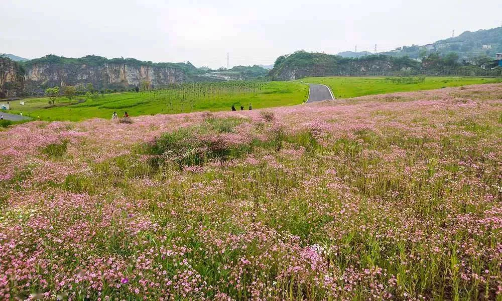 4月19日,重庆南山上千亩废弃矿坑经生态修复已披“绿装”,粉红色的麦蓝菜花开遍野,如高山草原,甚为壮观美丽,吸引市民纷纷前来拍照游玩。(图/凌舸智)
