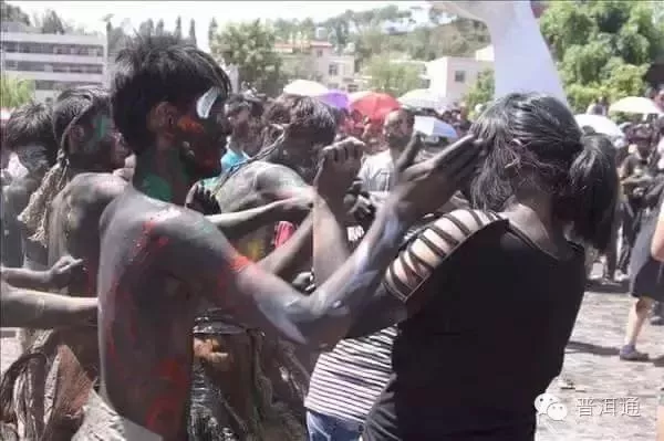 5月1日,人们在云南省墨江哈尼族自治县的太阳广场上进行“摸你黑”狂欢。数万名游客以哈尼族“摸你黑”的方式互抹“黑脸”,表达彼此的祝福和趋吉避凶的希望。