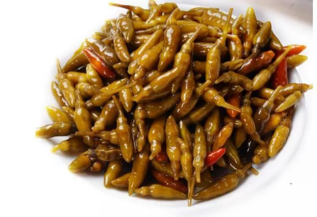 腌蚂蚱保持味道香辣可口,可以当零食吃,还可以下饭吃,是下酒的佳品,是当地招待客人,馈赠远方亲朋好友的一道地方菜,远近有名。