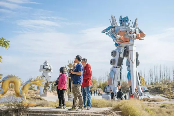 在沙漠公园里面有外形巨大的变形金刚,还有星球大战的黑武士这些电影人物造型雕像,吸引了大量游客前来拍照打卡。这里绝对是最惹眼的景点了。如果在这附近拍照,衬托着沙漠植物,是不是很有外太空的感觉。
