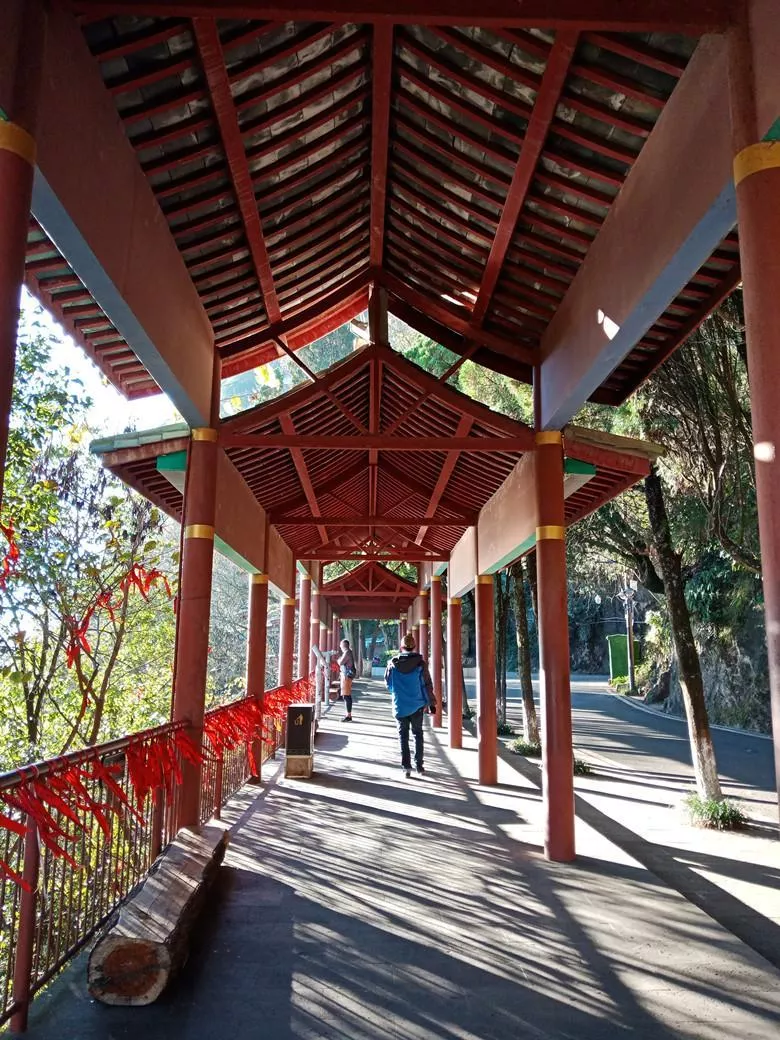 在长廊中,每天都有人来这健身。面向滇池,长廊的右手边是继续登顶的检票口,左手边是去往小石林等西山内小景点的路。如果此时觉得累了,左手边还有观光车拉你下山。