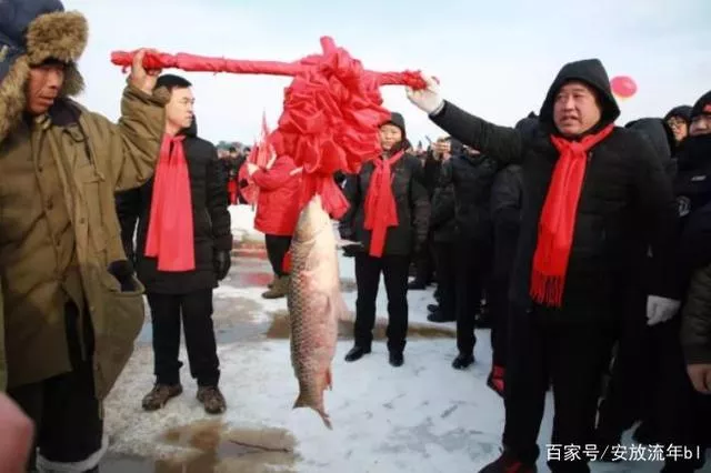 随着鱼把头的一声号令,拉网机械车辆启动,几名身强力壮的渔工们激情高昂,用力拉起冰面下布好的鱼网。不一会,600多米长的大网从冰洞中渐渐滑出,胖头鱼、鲤鱼、鲢鱼等在鱼网里欢腾跳跃。一直守在起网现场的人群瞬间发出欢呼声,围观的人们纷纷拿起手机记录下这“冰湖腾鱼”的盛景。