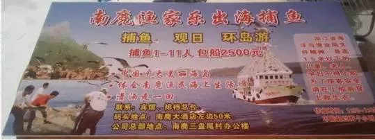 出海捕鱼、环岛游:包船,1-10人,3000元,11-15人,3500元,3小时以内,5海里内。