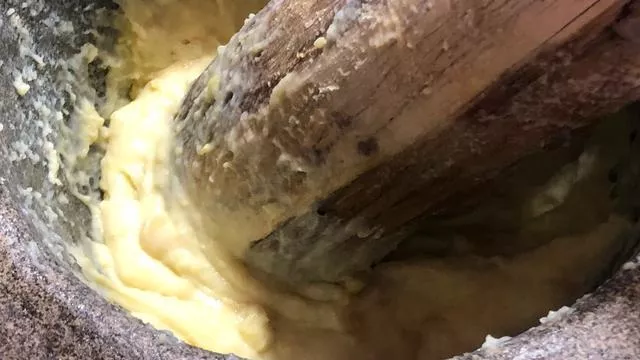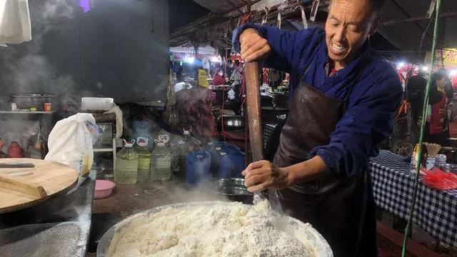 最后还得再来介绍一道美食,那就是洋芋搅团,用的是我们太白县一带种植的土豆,这种土豆吃起来是绵的,特别适合做洋芋搅团,把蒸好的土豆放入窝臼让壮汉使劲捶打而成,这样做成的搅团丝滑劲道,配上调好的蘸汁,很能让人情有独钟的。