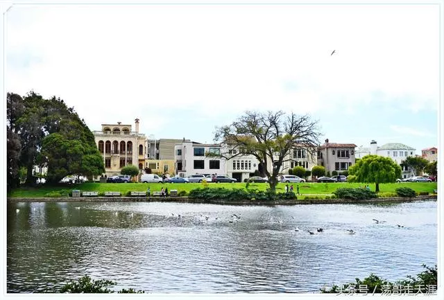 艺术宫前面的湖面上各种海鸟自由自在地飞翔。