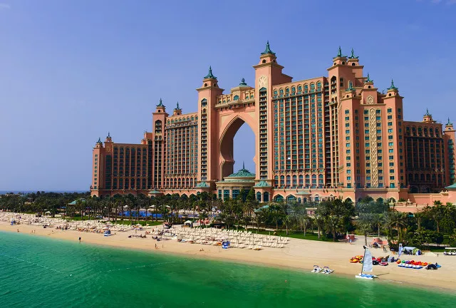 这是迪拜知名度最高的酒店,也是全球唯一一家七星级酒店,帆船酒店以金碧辉煌、奢华无比著称,建在离沙滩岸边280米远的人工岛上,仅有一条弯曲的道路连结陆地,酒店共有202套房,都是复式的,最小170平米,最大皇家总统套房780平米,平均一晚住宿费万元人民币,酒店顶部设有停机坪非常豪华,因此该酒店被称作波斯湾的明珠。