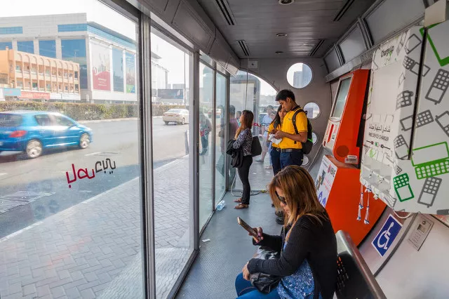公交站是迪拜一个亮点,设计极具现代感。 而且大部分的公交站台都有一个冷气房提供给等车的人,非常人性化。