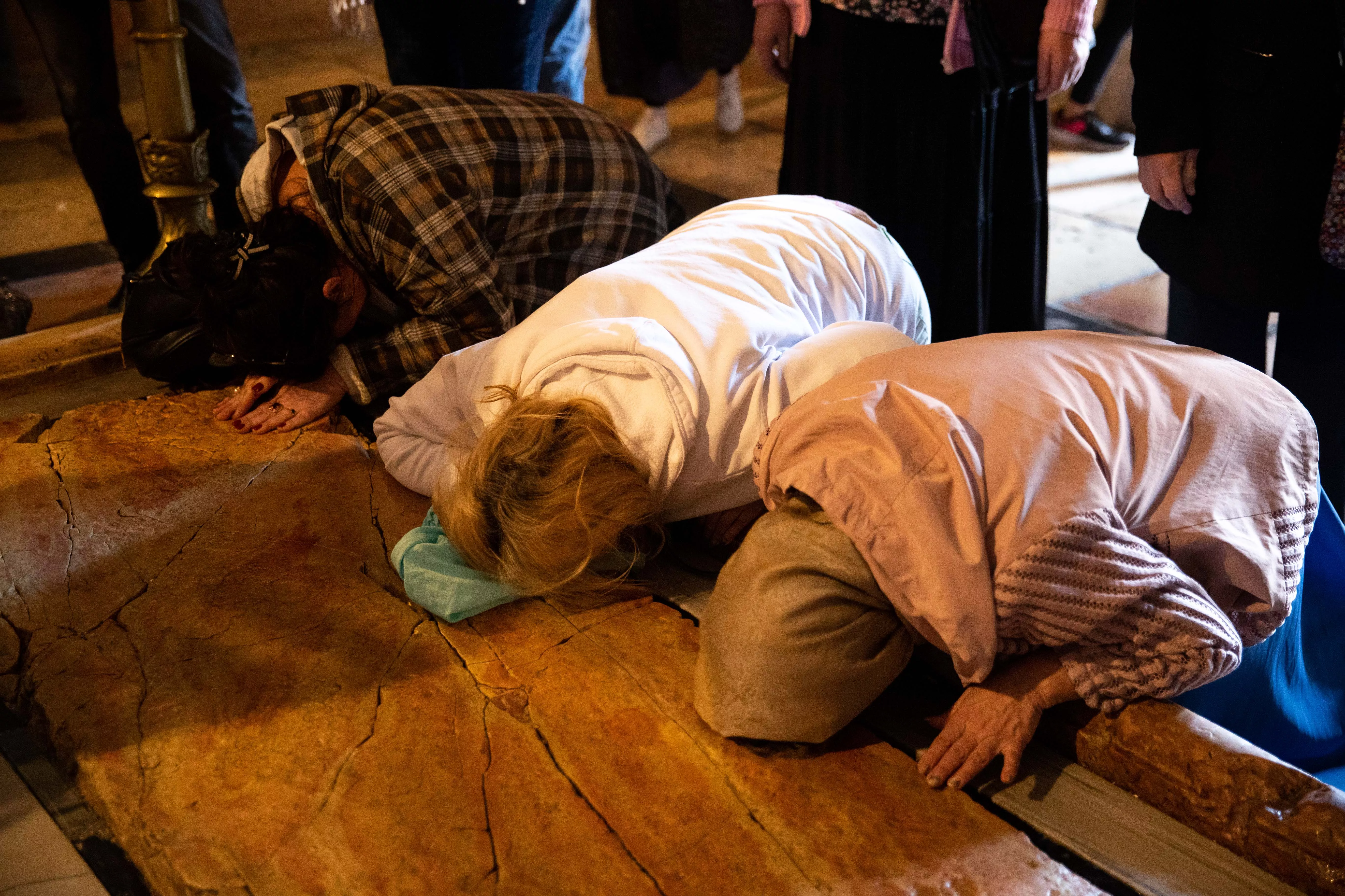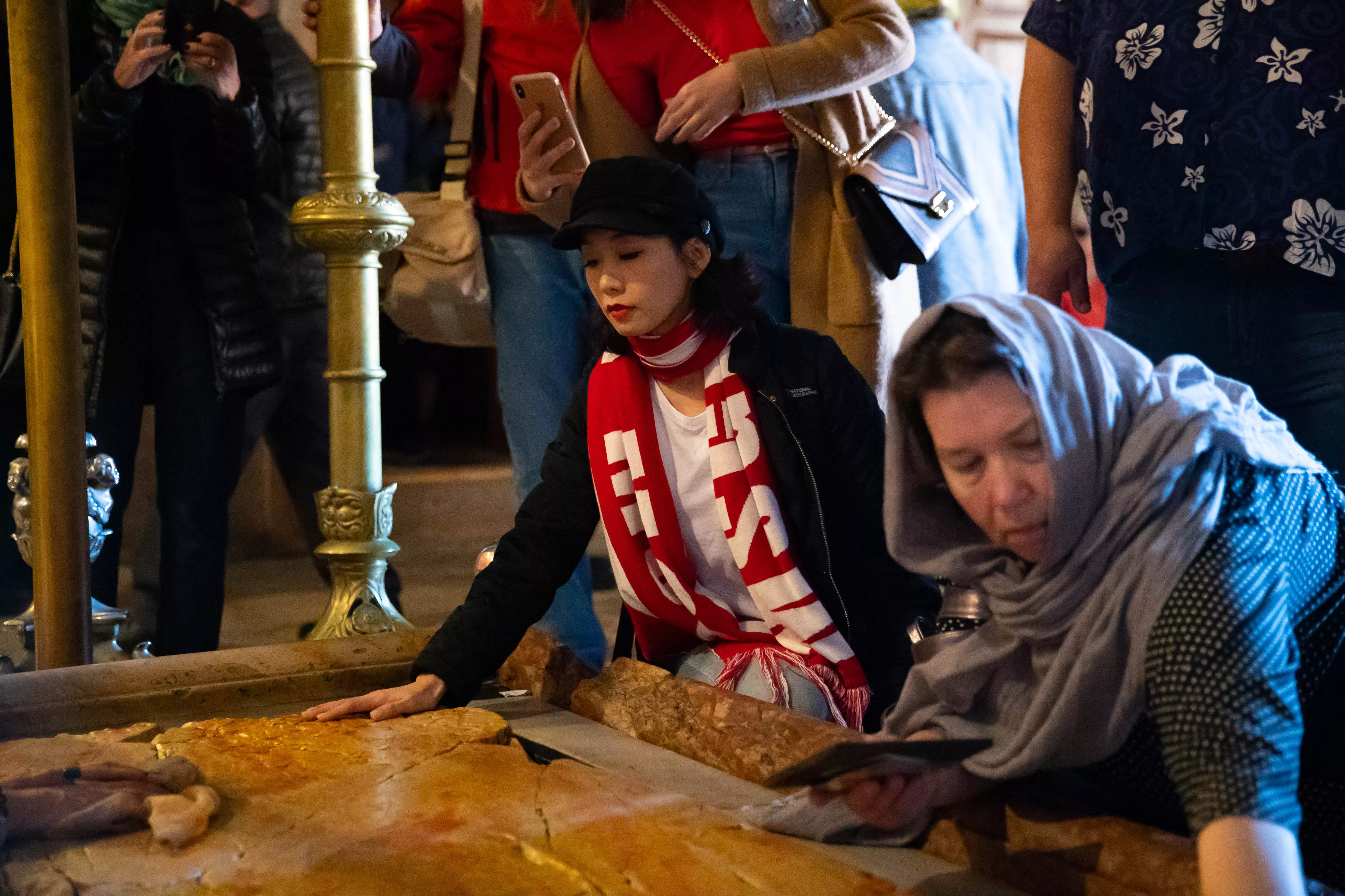 更多的人则是长时间跪下,亲吻这块据信是浸透着耶稣的血的石头。