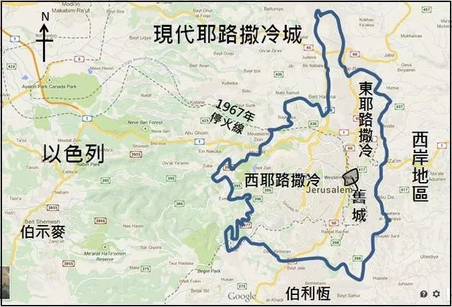 耶路撒冷市区面积约100平方千米,其中旧城约1平方千米,人口约42万。耶路撒冷是以色列和巴勒斯坦共有的首都(双方都有争议)。