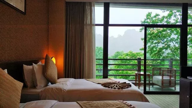这里的森林覆盖率达85%,负氧离子含量极高,内设几十个功能各异的温泉池,集道教养生,治疗保健,美容美体于一体。