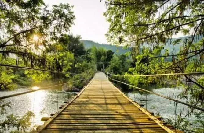 天菊铁索桥原名叫“众旺桥”,曾经有两部电视剧在这里取景。伴着秋日里的阳光,在铁索桥上穿过清澈透底的河,武打片的行走天涯场景感~~在桥上拍拍照,一咔就是一张大片!可惜现在在铁索桥旁边2米处就建了一座钢筋水泥大桥,对于拍照的人真是一个障碍。