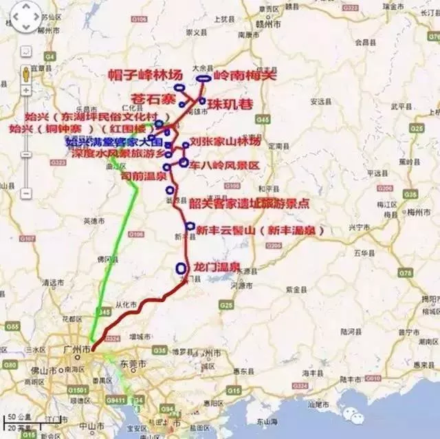 自驾路线:始兴县城(永安大道—墨江桥北路—墨江大桥—墨江桥南路)—河南路—沈所镇—Y326—铜钟寨景区。