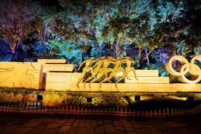 晚上时公园只开放北门,从北门进入可以看到一池喷泉水,沿着水边行走在公园内,这有很多与奥运相关的雕像,其中最壮观的应该是奥林匹克浮雕墙,浮雕全长312.61米,均高2.7米,采用珍珠黑花岗岩石材雕刻成的,奥林匹克浮雕墙,该墙无论展示规模、形式以及内容为世界仅有。