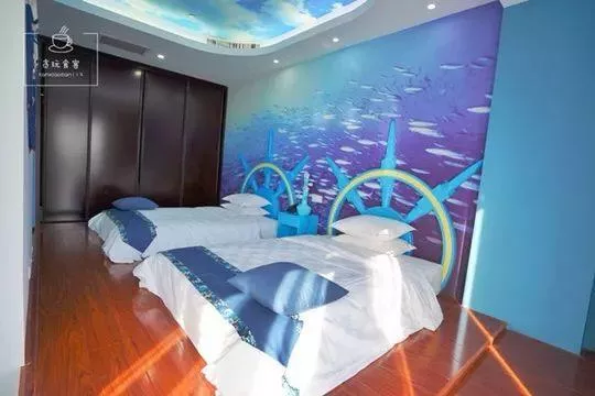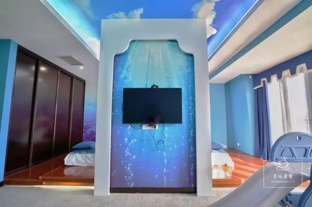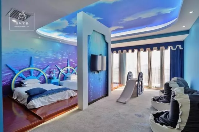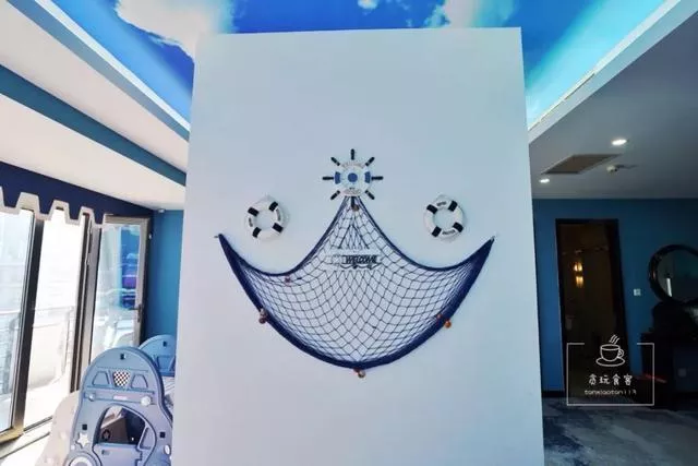 整个房间,最有特色的当属卧室。既然是海洋主题房,自然少不了碧海蓝天及海洋生物。双床房卧室主要以榻榻米形式为主,背影墙上彩绘着鱼群图案,床头是船舵设计,抬头可见蔚蓝色的“天空”,眼前则是海船造型的摆件,总之躺在床上就会有海洋探险的代入感。