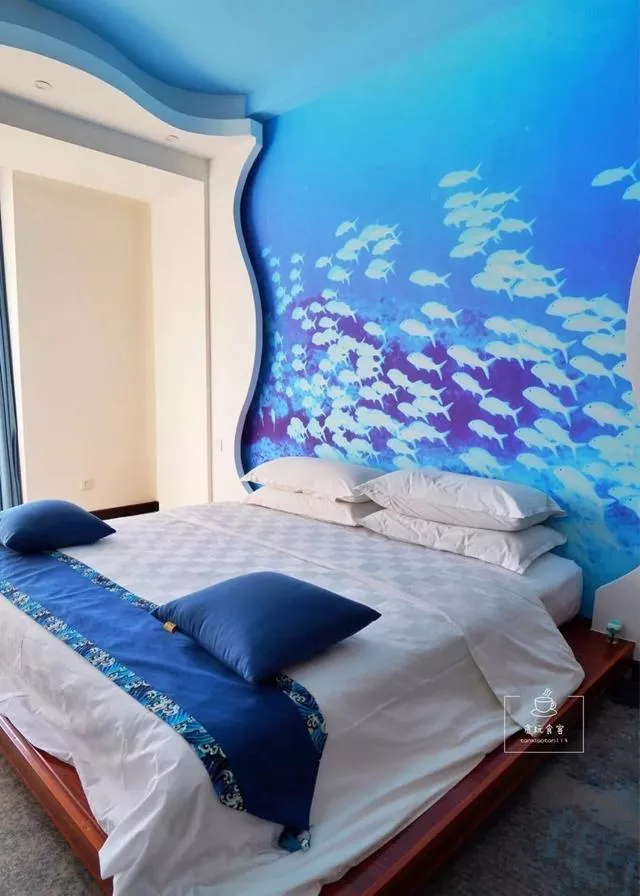 另外一件卧室也是海洋主题,只不过这是一间大床房,床头上依然可见鱼群图案。