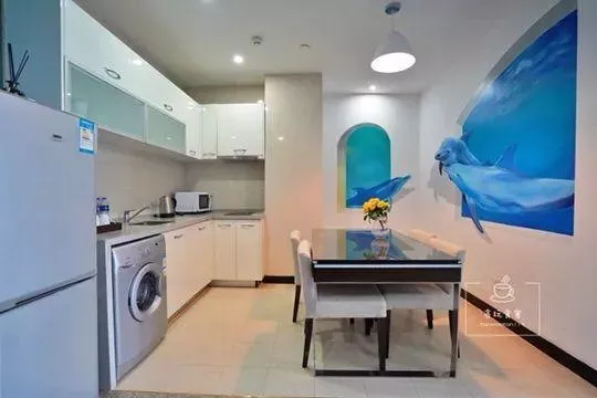 一进门左手边是厨房,灶台上摆放着饮品小吃,还有电水壶、微波炉等小家电,旁边是冰箱和洗衣机。厨房的墙角上画着三只海豚的3D图案,仿佛要破墙而出,与我们共享大餐。