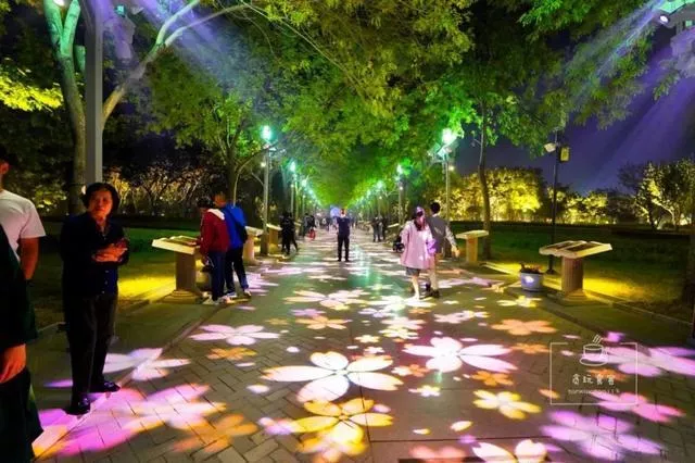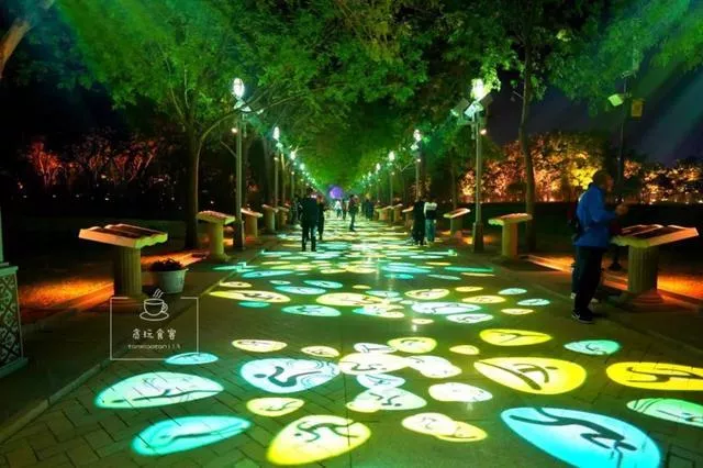 在一条步行道上,这里还有绚烂的灯光将让路面铺上了斑斓的外衣:星座、隐形、花瓣、奥运印章等等,随着灯光颜色的变化,路面上出现了不同的图案,让整条路充满梦幻。