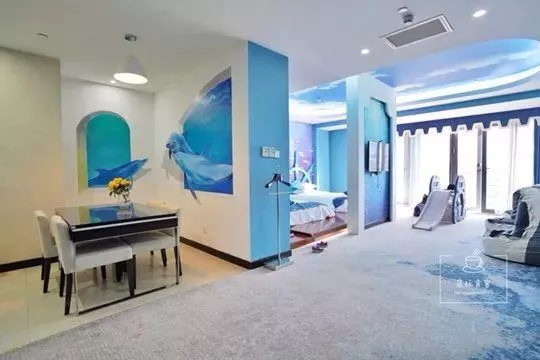 在前台办理好入住后,我们坐电梯来到了五层的海洋亲子主题房。推开门,一片颜色调的房间出现在眼前,宽大方正的客房有四部分组成:卧室、开放式厨房及客厅、洗漱间。