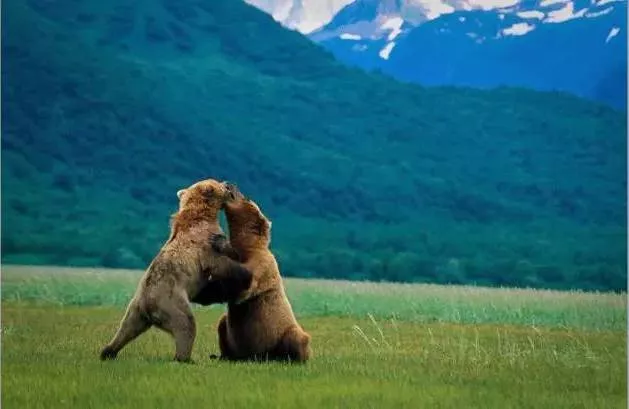 阿拉斯加原野上生活着5万多头野生黑熊和3万5千头野生棕熊,他们会伐木穿过浆果覆盖的山坡,率先抵达鲑鱼途径之路,先发制鱼,待鲑鱼跃河流,棕熊能一招制敌,瞬间拍住跳跃起的鲑鱼。瞬间发掘出自然界的弱肉强食。
