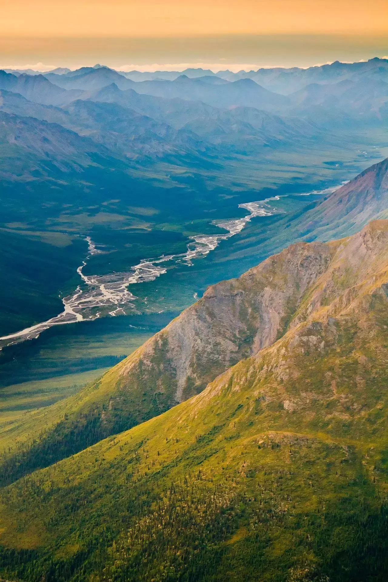 迪纳利国家公园环抱麦金利山,依傍阿拉斯加山脉,宛若一幅卓然天成的旷野画卷,这里的山脉没有森林覆盖,一望无垠、摄人心魄的自然美景。