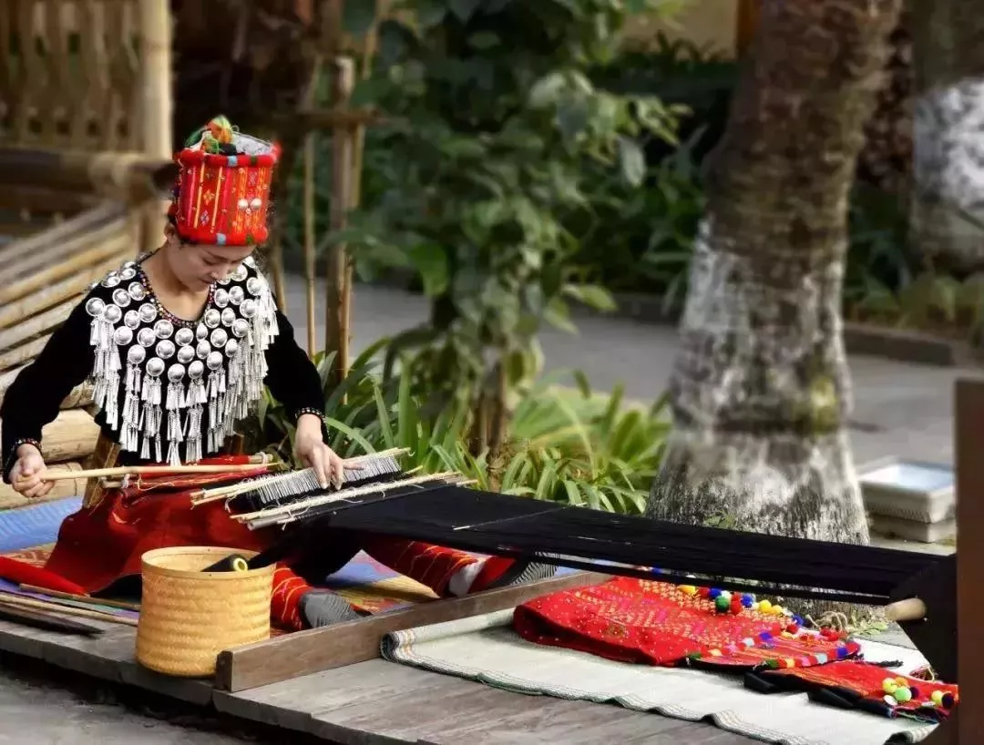 云南民族村的景颇寨,延续了景颇族这一古老的编织技艺。走进山官房的正堂,就能近距离观赏到精致的景颇筒裙服饰,领略景颇人的智慧。
