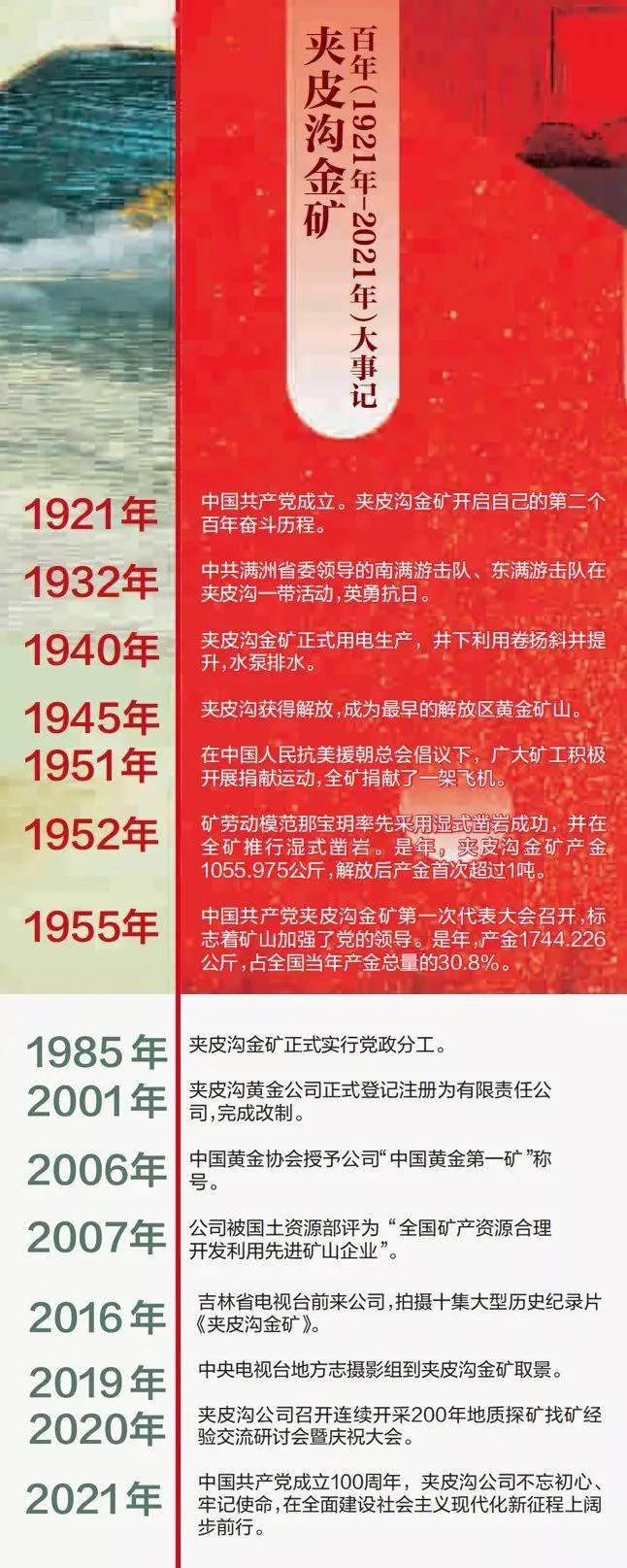 201年的采金史,这在全国同类矿山中无出其右。同样值得记忆的还有一系列的第一:第一个被中国共产党接管的大型黄金矿山,第一个恢复生产的大型机械化矿山,第一个掌握多项先进技术而被国内同行所借鉴的矿山。