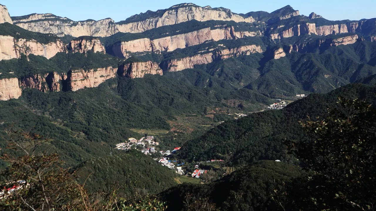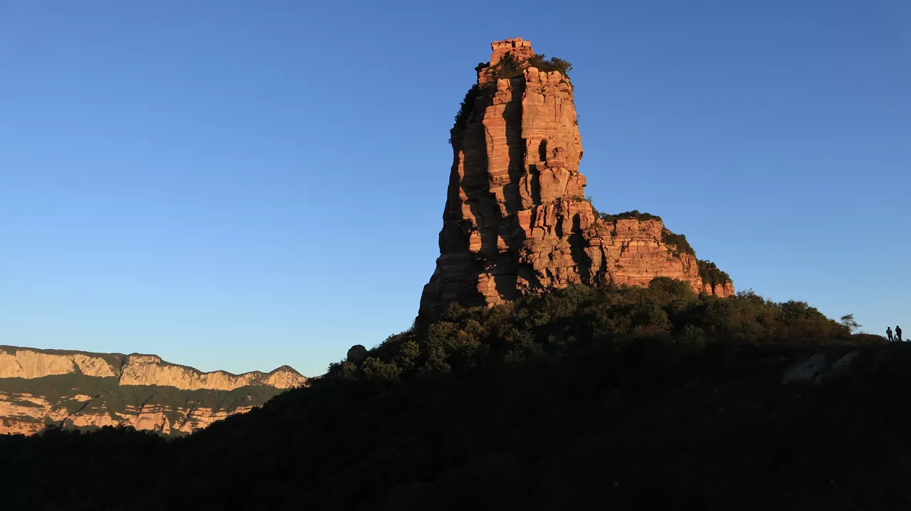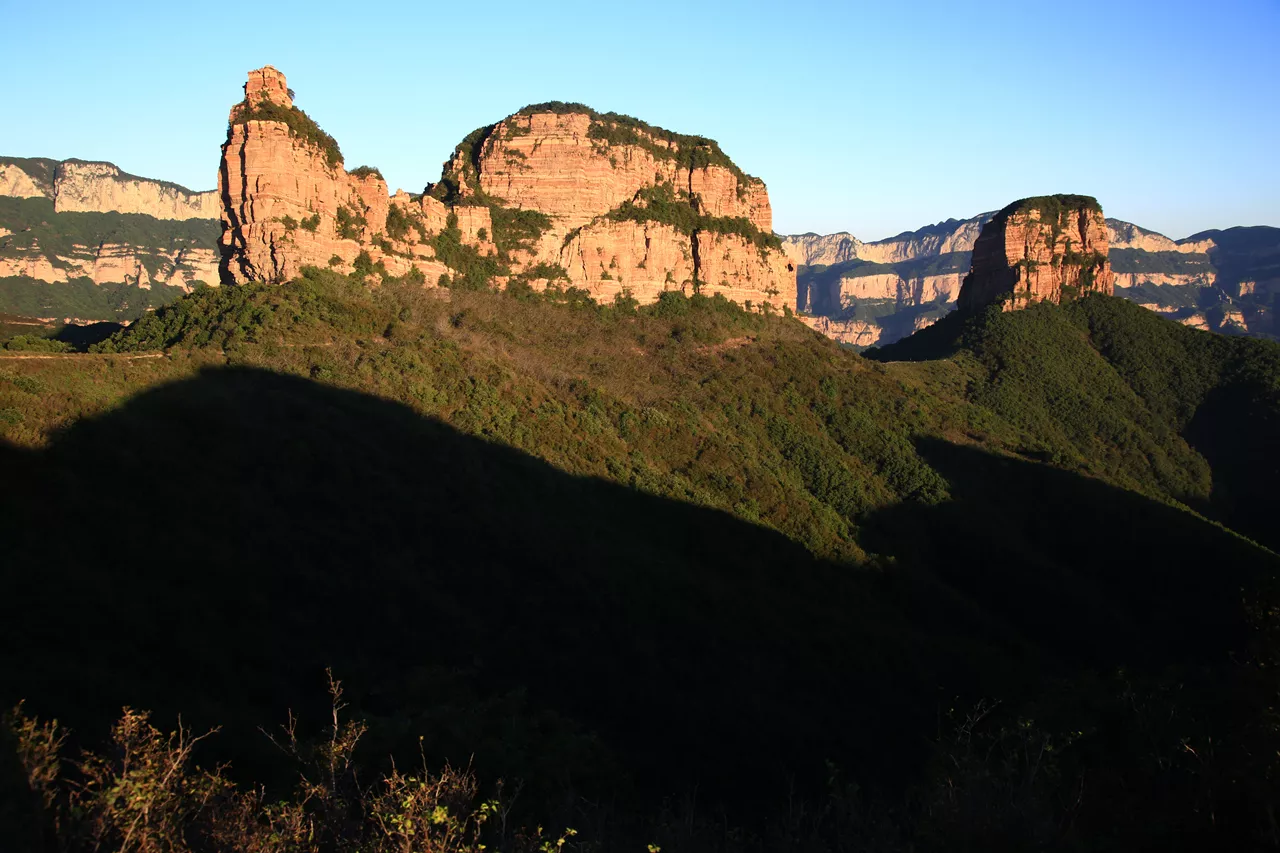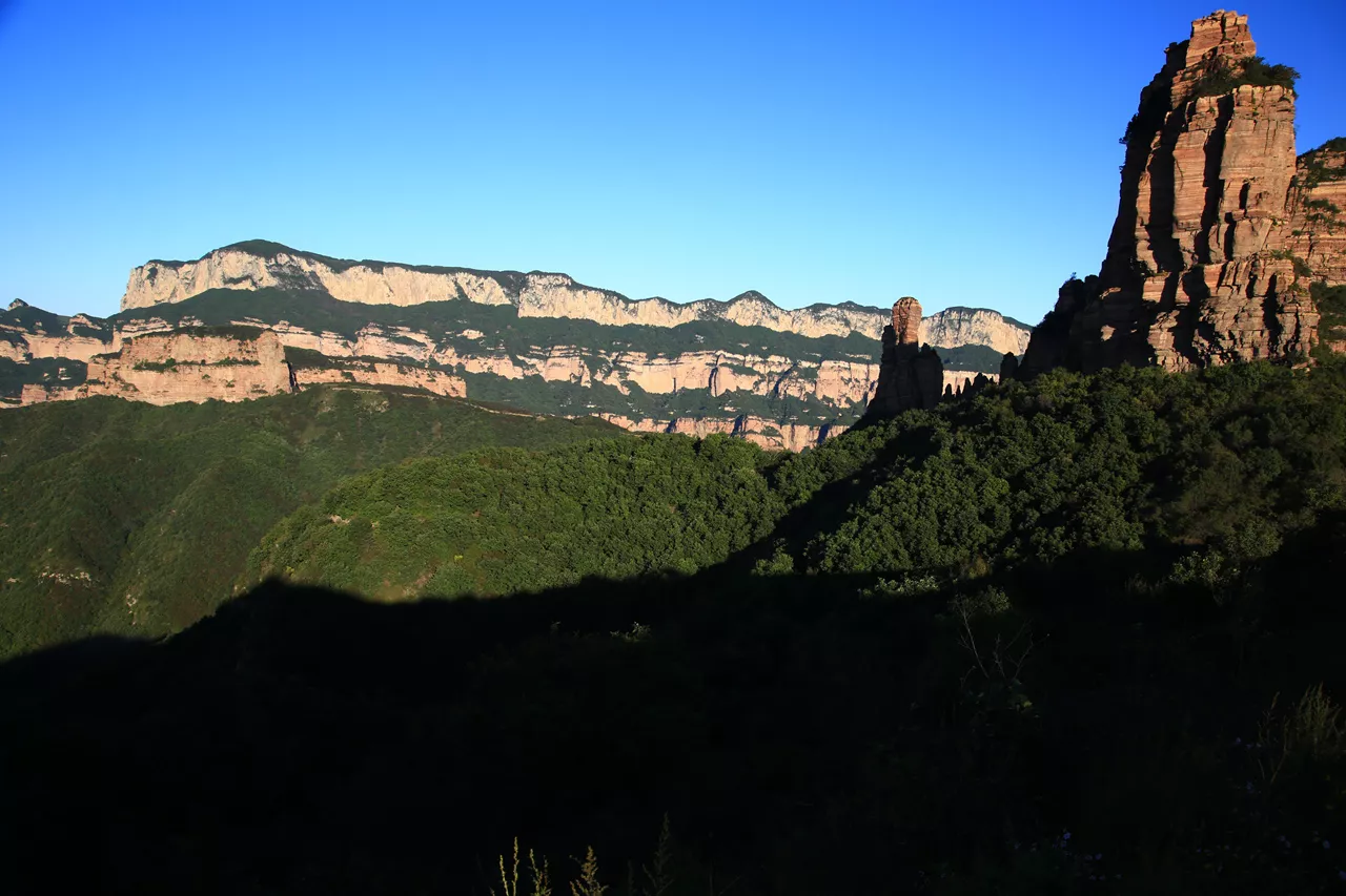 巨大的嶂石岩分三层(三栈)拔出,清晰可见。试想当年(3亿年6亿年两度)太行山崛起时,真是天崩地裂,鸟兽飞藏,神鬼不宁。出现了“天倾西北,地不满东南”“天柱折,地维绝”的恐慌现象。
